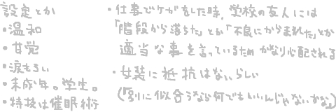 創作企画の皆さん・・・とおっしゃってたので・・・大丈夫ですよね・・・?(← 「キャラに意外な質問バトン」 ・創作キャラになりきって答えましょう。プロフ欄に書くことが増えるかもしれません。 ・何人でもOK。会話形式にするのも面白いかもしれません。 キャラ:ユウ(手ブロで頻繁に描いてるオリジです) ユウについてと解答は追記に書きます。 ←手ブロにて、友達限定公開だったやつの加工版 http://blog.cnobi.jp/v1/blog/user/b24119660de6d8421ba0f6530d49ee05/1222874479 ↑コメント欄に書いた設定。 未定部分とかコレだけじゃ不明なところとか多々ありますが気にしない方向で(← 以下回答です。 ------------------------------ 「はじめまして。ユウです。ルカが答えてて何か面白そうだったから 俺もやってみようかなーと思って頂いて来た。勝手に悪いな(笑) んじゃあ早速答えさせてもらうよ~」 ・目玉焼きにかけるものといえば? 「目玉焼きはパンに乗せるもんだろ。特に何もかけないがベーコンとか一緒に焼くのは好きかな。」 ・闇鍋をやるとしたら何をいれる? 「うに。殻つきで。 あ、栗でもいいか。イガ付きで。」 ・毎週土曜の午後9時ごろやっている事は? 「仕事してるか夕飯の片付けかな・・・あ、あと宿題?日曜に遊ぶために土曜には全部終わらせとくよ。 たまに提出日に友達に見せてもらってるけどな(笑) でも普段は見せる側だぞ。」 ・自分は攻め受けどっち?また、そのお相手は? 「うーん・・・どっちでもないんじゃないかな?ホラ、俺どちらかというと自分では手出したくない人だから。 え?戦うとかそういう問題でじゃないの?」 ・行ってみたい市は? 「今居るところが一番好きだけど・・・あ、沖縄行ってみたいかも。何市があるか知らないけど。」 ・朝学校(or職場など)に行く時、家を出て200メートルの地点で忘れ物に気づきました。 時間もありません。帰る?そのまま行く? 「学校なら、その日の授業によるかな・・・忘れ物できない授業なら戻るし、遅刻するとヤバイ授業なら友達とかに借りるかな。 仕事なら取りに帰る。それくらいの遅刻なら電話とかで連絡すれば大丈夫だし。」 ・自分に無言電話をかけてきそうな人といえば? 「あんまりいなそうだけどなあ・・・強いて言えば友達かな?学校の。」 ・版権の世界へ行けるなら、どのジャンルへ行って誰と何する? 「版権って何?」 ・次に回すキャラさん 「拾い物だから特に指定しないでおくよ。やりたい人はご自由に、だってさ。」 「誰かからの質問に答えるのも悪くないな。自分の知らなかった事とかもたまに発見したりできるし。 面白かったぜー。回してくれてさんきゅーな!んじゃ俺はこの辺で。」 ------------------------------ オリジ、ユウでした。 口調がまだはっきりつかめてません(← この見た目で「俺」って変でしょうか・・・; しかし年齢が10代後半あたりなんで「僕」はもっと変かと思いまして・・・ ユウは家庭環境の関係もあり、かなり狭い世界で育ったため たまに一般常識でも知らない事があります。 しかし、物によっては異様に詳しいです。理科系はその辺の学校の先生より詳しいかもしれない。 親(にしん)の頭が着いていかないという難点はありますが(← PR この記事にコメントする